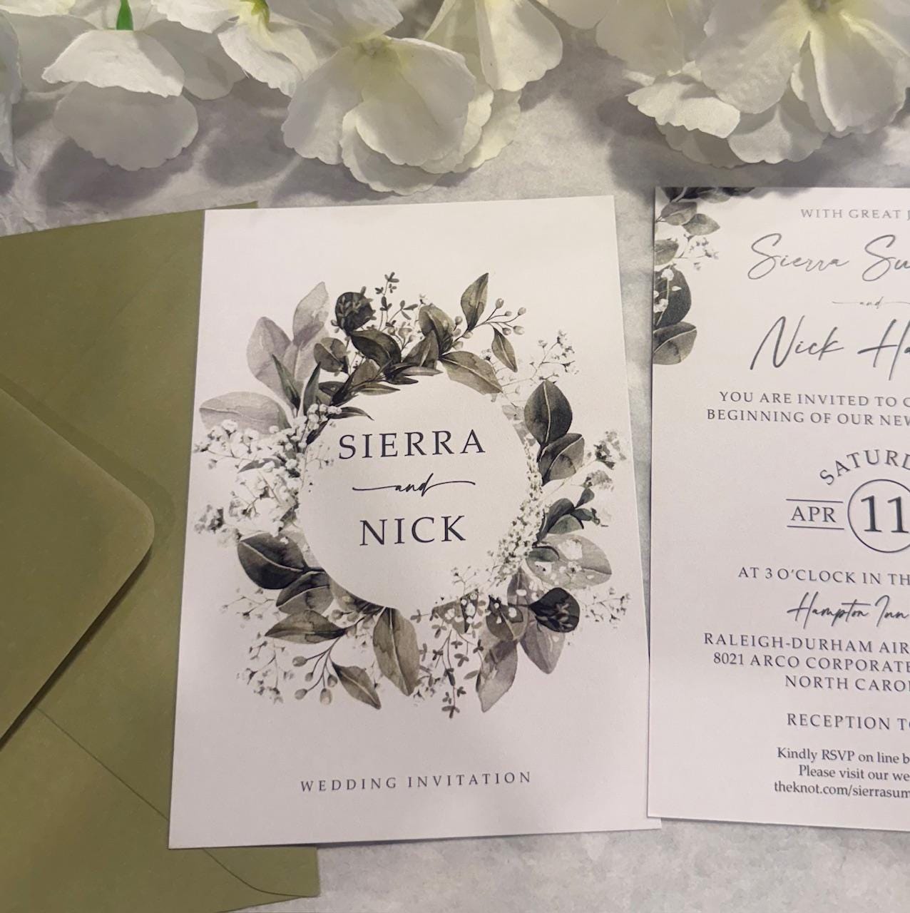 Baby's breath A6 wedding invitations with envelopes feature Gypsophila & sage green greenery