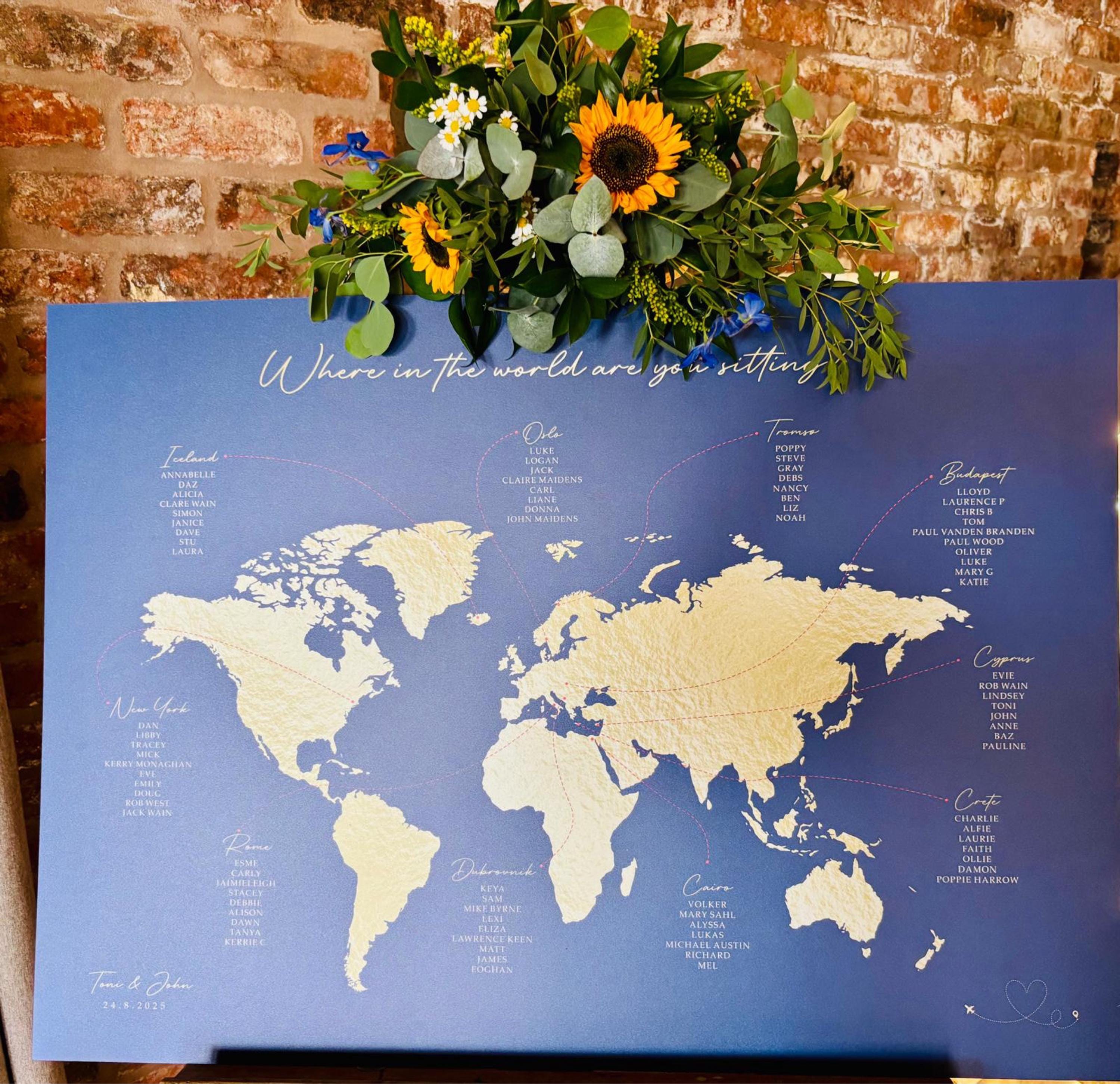 World Map Passport A1 or A2 Seating Chart Table Planner featuring a world map available in any colour - printed on PVC Foamex Board ready to place on an easel.