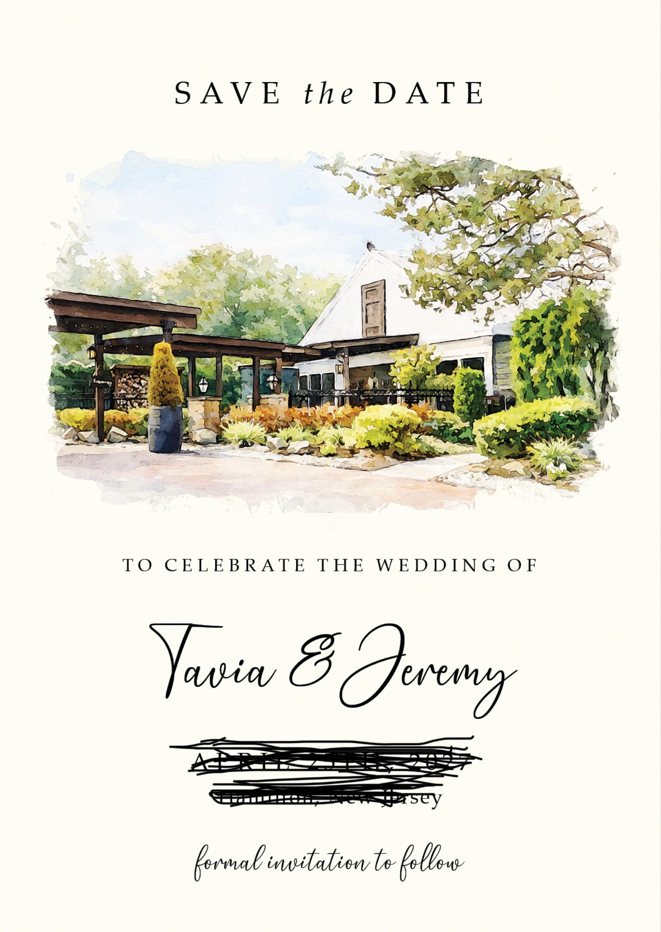 Digital e-invite venue save the date cards featuring your wedding venue as a watercolour painting illustration. All you need to do is provide a picture/image of your wedding venue and we will transform it to give a watercolour painting effect which we email to you for approval.
