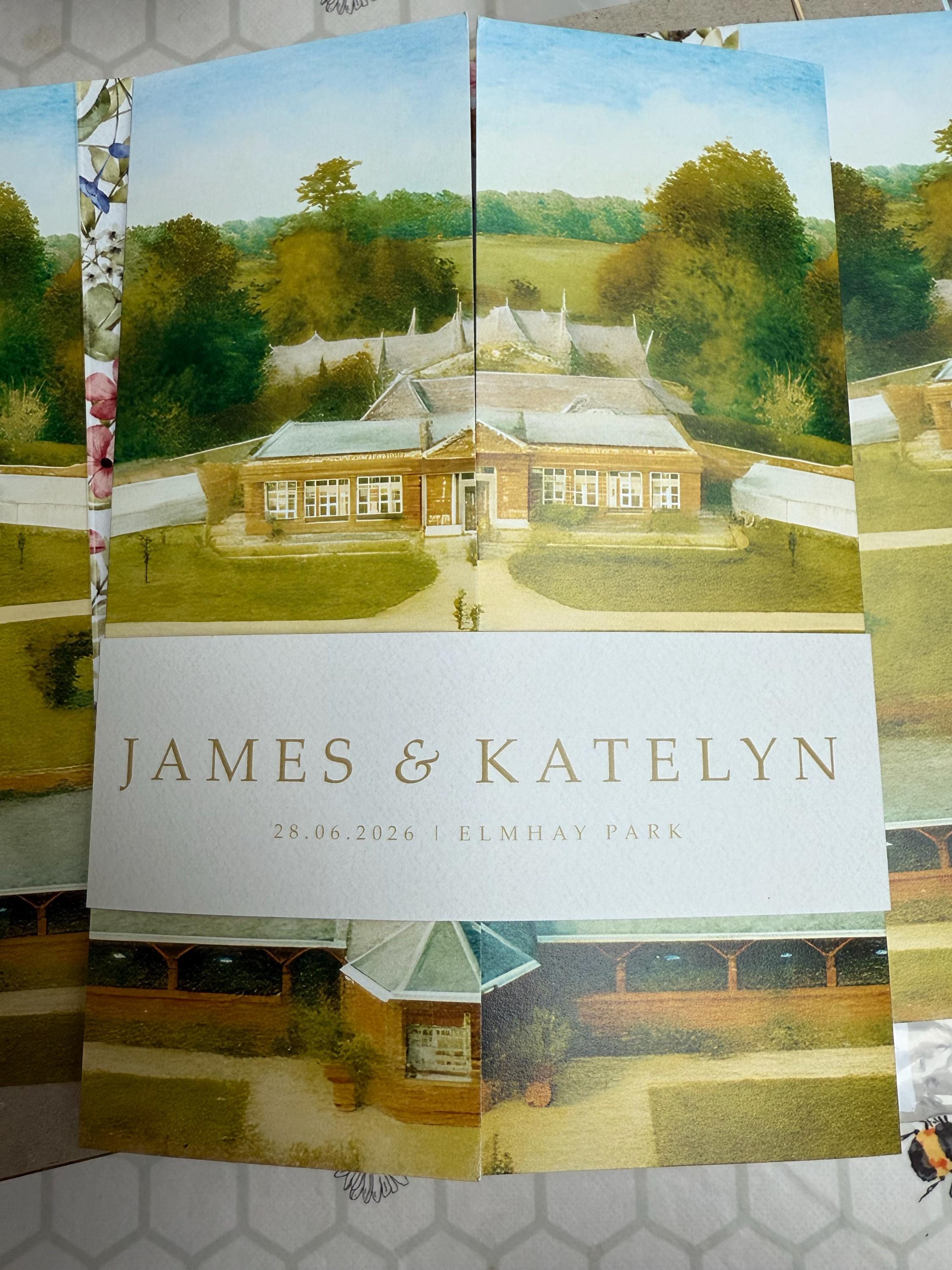 Personalised Garden Watercolour Gatefold Wedding Invitations with your photo or venue illustration, floral design, and optional belly band — elegant and custom-made.